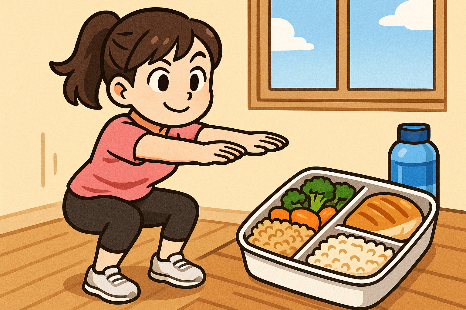 - 월/수/금: 전신 근력 (스쾃 20개, 플랭크 1분, 런지 15회씩 × 2세트)
